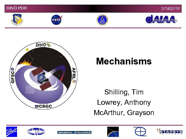 DINO PDR 3/19/2018 Introduction • Mechanisms includes restraints and release for: – Aerofins – FITS thin film solar arrays – Gravity gradient tether • The mechanisms will release the deployables in a predetermined order – Gravity Gradient Tether – FITs – Aerofins • The restraint mechanisms are based around Planetary Systems’ Lightband, Starsys’ HOP (High Output Paraffin Actuator) and Ti. Ni Aerospace’s Frangibolt Colorado Space Grant Consortium
