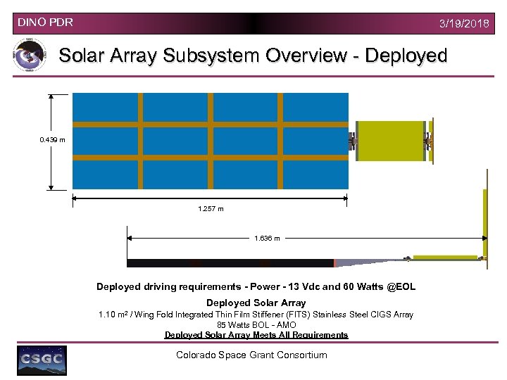 DINO PDR 3/19/2018 Solar Array Subsystem Overview - Deployed 0. 439 m 1. 257 m 1. 636 m Deployed driving requirements - Power - 13 Vdc and 60 Watts @EOL Deployed Solar Array 1. 10 m 2 / Wing Fold Integrated Thin Film Stiffener (FITS) Stainless Steel CIGS Array 85 Watts BOL - AMO Deployed Solar Array Meets All Requirements Colorado Space Grant Consortium