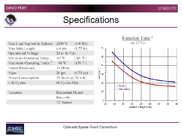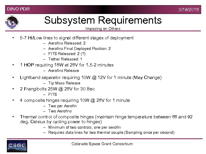 DINO PDR 3/19/2018 Subsystem Requirements Imposing on Others • 5 -7 Hi/Low lines to signal different stages of deployment – – • Aerofins Released: 2 Aerofins Final Deployed Position: 2 FITS Released: 2 (? ) Tether Released: 1 1 HOP requiring 18 W at 28 V for 1. 5 -2 minutes – Aerofins Release • Lightband separator requiring 10 W @ 12 V for 1 minute (May Change) – Tip Mass Release • 2 Frangibolts 25 W @ 28 V for 30 Sec – FITS • 4 composite hinges requiring 10 W @ 28 V for 1 minute – Two per Aerofin – Two Aerofins • Thermal control of composite hinges (maintain hinge temperature between 88 and 92 deg. Celsius by cycling power to hinges) – Minimum of two controls, one per aerofin – Requires data lines for two thermal couple (Sampling once per second) Colorado Space Grant Consortium