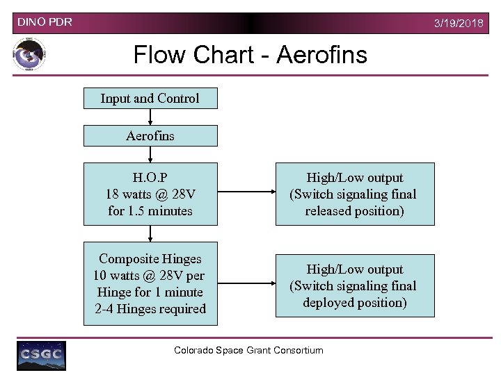 DINO PDR 3/19/2018 Flow Chart - Aerofins Input and Control Aerofins H. O. P 18 watts @ 28 V for 1. 5 minutes High/Low output (Switch signaling final released position) Composite Hinges 10 watts @ 28 V per Hinge for 1 minute 2 -4 Hinges required High/Low output (Switch signaling final deployed position) Colorado Space Grant Consortium