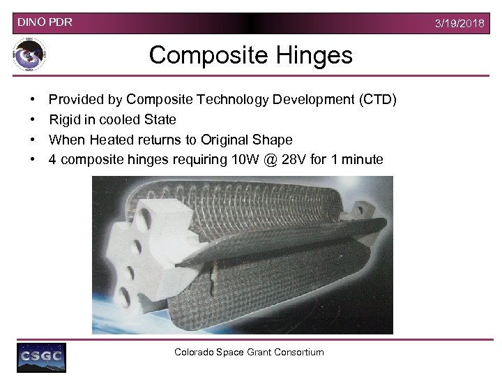 DINO PDR 3/19/2018 Composite Hinges • • Provided by Composite Technology Development (CTD) Rigid in cooled State When Heated returns to Original Shape 4 composite hinges requiring 10 W @ 28 V for 1 minute Colorado Space Grant Consortium