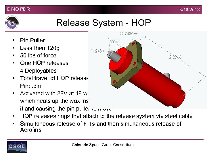 DINO PDR 3/19/2018 Release System - HOP • • Pin Puller Less then 120 g 50 lbs of force One HOP releases 4 Deployables Total travel of HOP release Pin: . 3 in Activated with 28 V at 18 watts for 2 minutes, which heats up the wax inside the piston, expanding it and causing the pin puller to move HOP releases rings that attach to the release system via steel cable Simultaneous release of FITs and then simultaneous release of Aerofins Colorado Space Grant Consortium