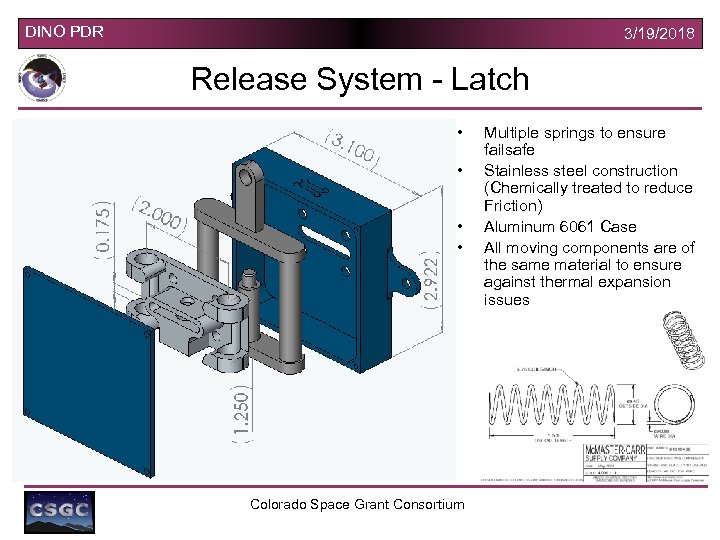 DINO PDR 3/19/2018 Release System - Latch • • Colorado Space Grant Consortium Multiple springs to ensure failsafe Stainless steel construction (Chemically treated to reduce Friction) Aluminum 6061 Case All moving components are of the same material to ensure against thermal expansion issues