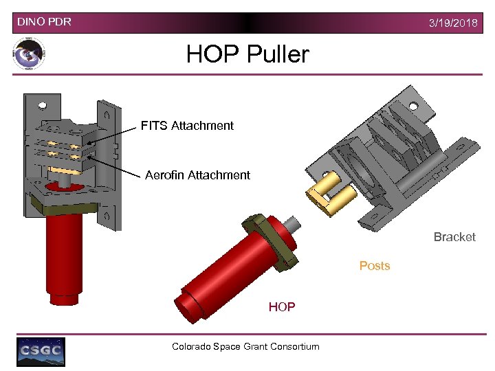 DINO PDR 3/19/2018 HOP Puller FITS Attachment Aerofin Attachment Bracket Posts HOP Colorado Space Grant Consortium