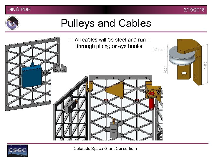 DINO PDR 3/19/2018 Pulleys and Cables - All cables will be steel and run through piping or eye hooks Colorado Space Grant Consortium