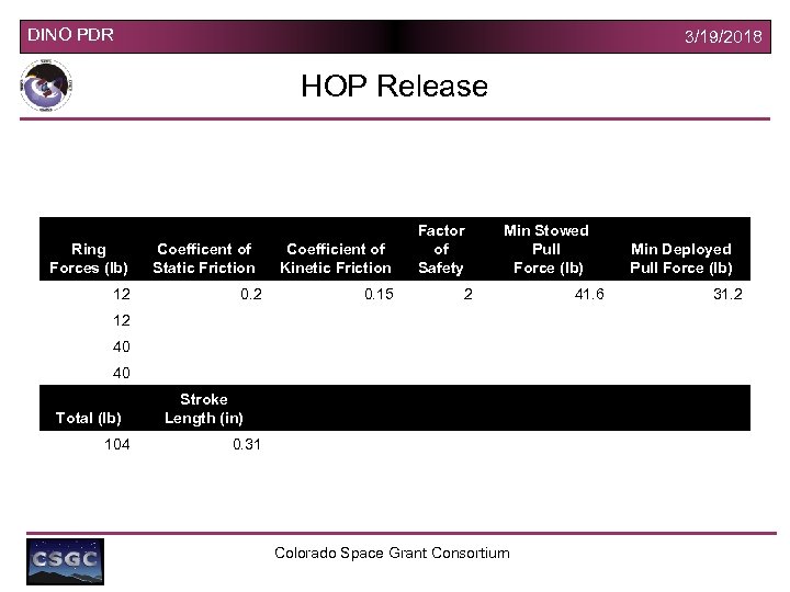DINO PDR 3/19/2018 HOP Release Ring Forces (lb) 12 Coefficent of Static Friction Factor of Safety Coefficient of Kinetic Friction 0. 2 0. 15 Min Stowed Pull Force (lb) 2 Min Deployed Pull Force (lb) 41. 6 31. 2 12 40 40 Total (lb) 104 Stroke Length (in) 0. 31 Colorado Space Grant Consortium