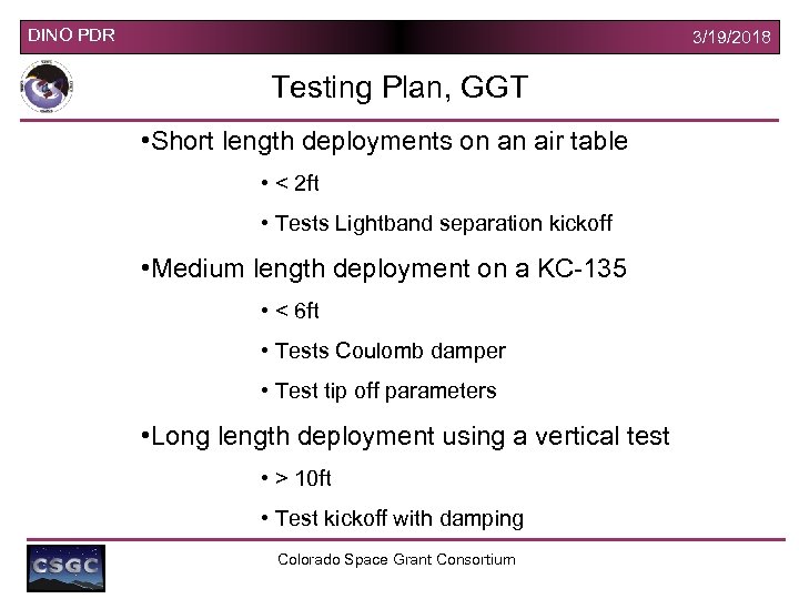 DINO PDR 3/19/2018 Testing Plan, GGT • Short length deployments on an air table • < 2 ft • Tests Lightband separation kickoff • Medium length deployment on a KC-135 • < 6 ft • Tests Coulomb damper • Test tip off parameters • Long length deployment using a vertical test • > 10 ft • Test kickoff with damping Colorado Space Grant Consortium