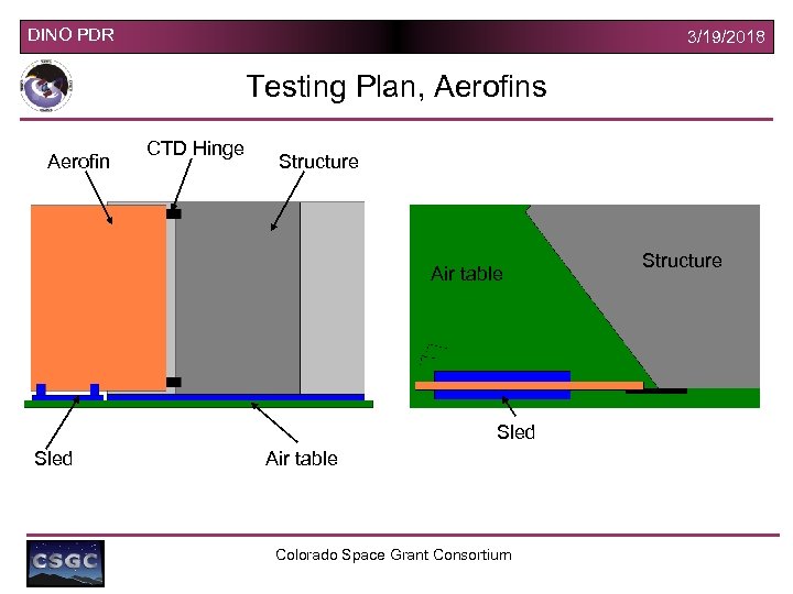 DINO PDR 3/19/2018 Testing Plan, Aerofins Aerofin CTD Hinge Structure Air table Sled Air table Colorado Space Grant Consortium Structure