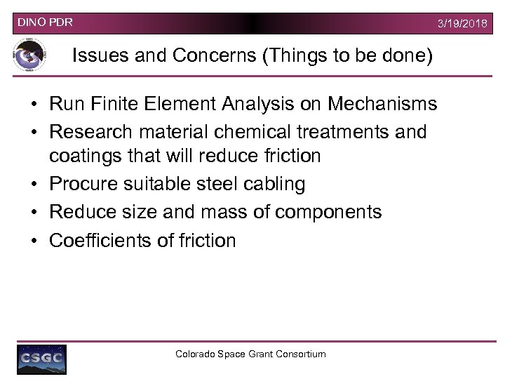 DINO PDR 3/19/2018 Issues and Concerns (Things to be done) • Run Finite Element Analysis on Mechanisms • Research material chemical treatments and coatings that will reduce friction • Procure suitable steel cabling • Reduce size and mass of components • Coefficients of friction Colorado Space Grant Consortium