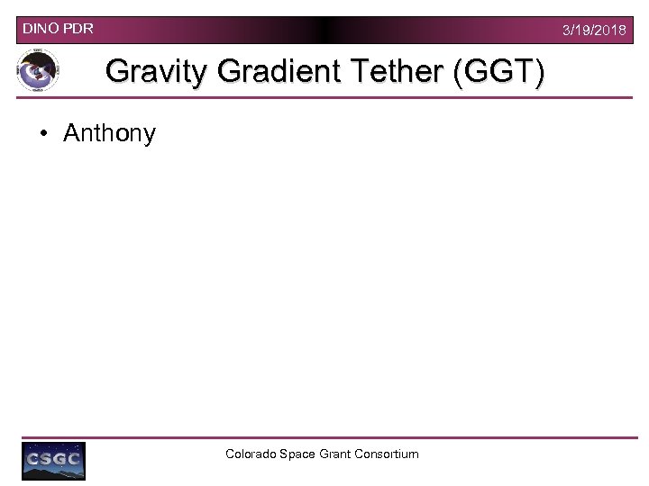 DINO PDR 3/19/2018 Gravity Gradient Tether (GGT) • Anthony Colorado Space Grant Consortium