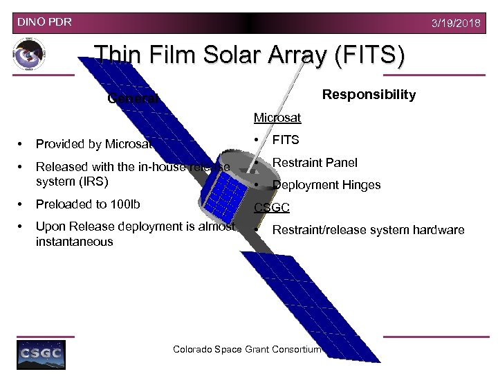 DINO PDR 3/19/2018 Thin Film Solar Array (FITS) Responsibility General Microsat • Provided by Microsat • FITS • Released with the in-house release system (IRS) • Restraint Panel • Deployment Hinges • Preloaded to 100 lb CSGC • Upon Release deployment is almost instantaneous • Restraint/release system hardware Colorado Space Grant Consortium