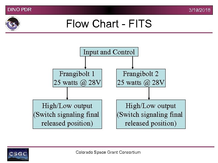 DINO PDR 3/19/2018 Flow Chart - FITS Input and Control Frangibolt 1 25 watts @ 28 V High/Low output (Switch signaling final released position) Frangibolt 2 25 watts @ 28 V High/Low output (Switch signaling final released position) Colorado Space Grant Consortium