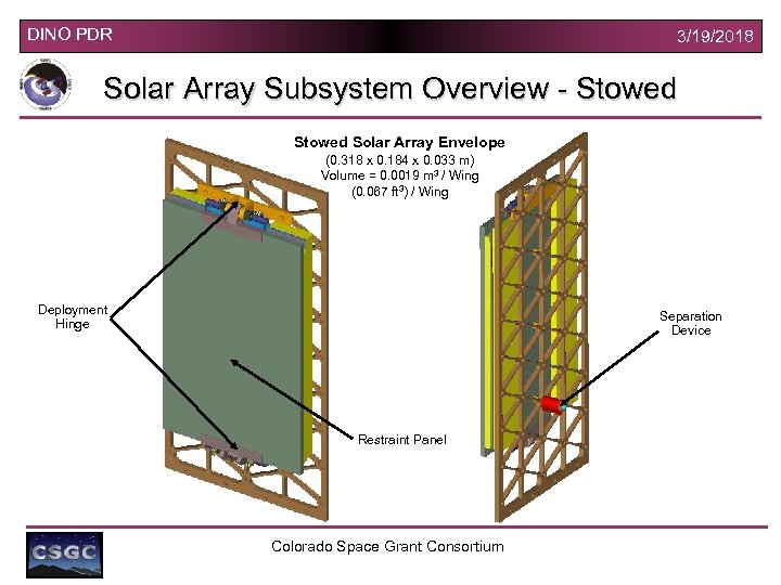 DINO PDR 3/19/2018 Solar Array Subsystem Overview - Stowed Solar Array Envelope (0. 318 x 0. 184 x 0. 033 m) Volume = 0. 0019 m 3 / Wing (0. 067 ft 3) / Wing Deployment Hinge Separation Device Restraint Panel Colorado Space Grant Consortium