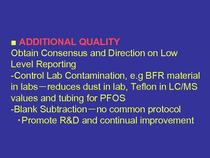 ■ ADDITIONAL QUALITY Obtain Consensus and Direction on Low Level Reporting -Control Lab Contamination, e. g BFR material in labs-reduces dust in lab, Teflon in LC/MS values and tubing for PFOS -Blank Subtraction-no common protocol ・Promote R&D and continual improvement