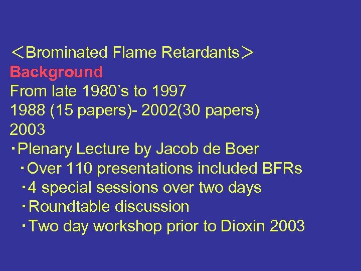 <Brominated Flame Retardants> Background From late 1980’s to 1997 1988 (15 papers)- 2002(30 papers) 2003 ・Plenary Lecture by Jacob de Boer ・Over 110 presentations included BFRs ・ 4 special sessions over two days ・Roundtable discussion ・Two day workshop prior to Dioxin 2003
