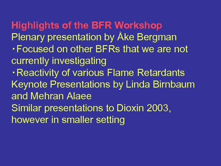 Highlights of the BFR Workshop Plenary presentation by Åke Bergman ・Focused on other BFRs that we are not currently investigating ・Reactivity of various Flame Retardants Keynote Presentations by Linda Birnbaum and Mehran Alaee Similar presentations to Dioxin 2003, however in smaller setting