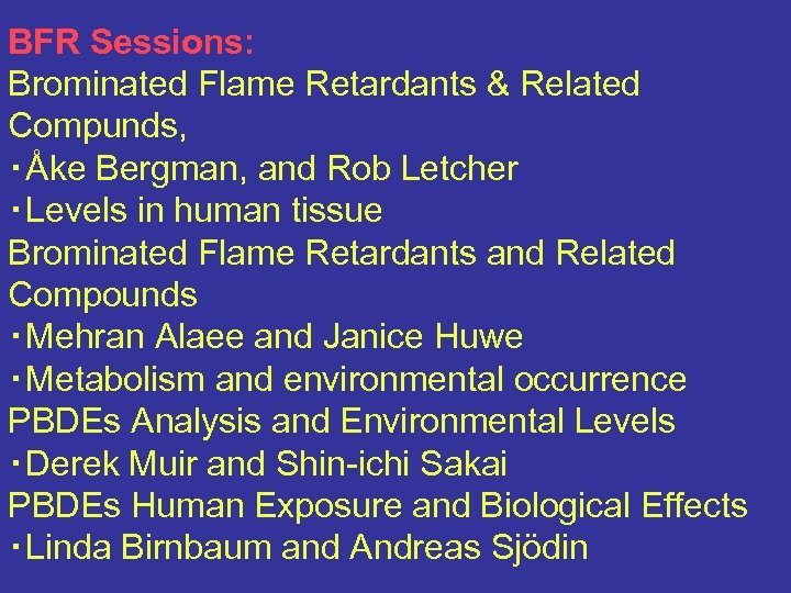 BFR Sessions: Brominated Flame Retardants & Related Compunds, ・Åke Bergman, and Rob Letcher ・Levels in human tissue Brominated Flame Retardants and Related Compounds ・Mehran Alaee and Janice Huwe ・Metabolism and environmental occurrence PBDEs Analysis and Environmental Levels ・Derek Muir and Shin-ichi Sakai PBDEs Human Exposure and Biological Effects ・Linda Birnbaum and Andreas Sjödin