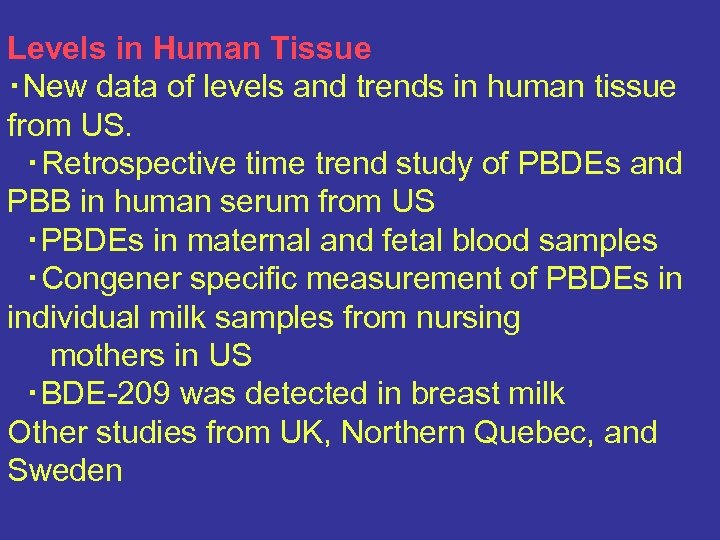 Levels in Human Tissue ・New data of levels and trends in human tissue from US. ・Retrospective time trend study of PBDEs and PBB in human serum from US ・PBDEs in maternal and fetal blood samples ・Congener specific measurement of PBDEs in individual milk samples from nursing mothers in US ・BDE-209 was detected in breast milk Other studies from UK, Northern Quebec, and Sweden