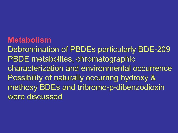 Metabolism Debromination of PBDEs particularly BDE-209 PBDE metabolites, chromatographic characterization and environmental occurrence Possibility of naturally occurring hydroxy & methoxy BDEs and tribromo-p-dibenzodioxin were discussed
