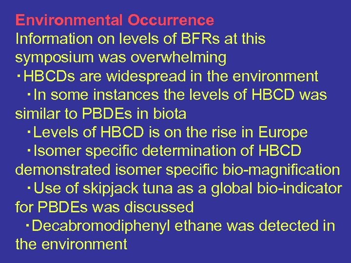 Environmental Occurrence Information on levels of BFRs at this symposium was overwhelming ・HBCDs are widespread in the environment ・In some instances the levels of HBCD was similar to PBDEs in biota ・Levels of HBCD is on the rise in Europe ・Isomer specific determination of HBCD demonstrated isomer specific bio-magnification ・Use of skipjack tuna as a global bio-indicator for PBDEs was discussed ・Decabromodiphenyl ethane was detected in the environment