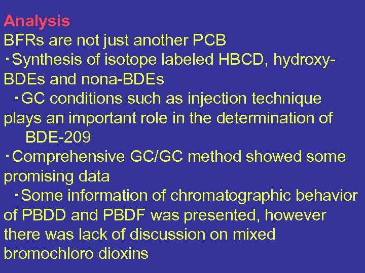 Analysis BFRs are not just another PCB ・Synthesis of isotope labeled HBCD, hydroxy. BDEs and nona-BDEs ・GC conditions such as injection technique plays an important role in the determination of BDE-209 ・Comprehensive GC/GC method showed some promising data ・Some information of chromatographic behavior of PBDD and PBDF was presented, however there was lack of discussion on mixed bromochloro dioxins