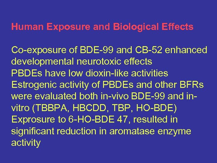 Human Exposure and Biological Effects Co-exposure of BDE-99 and CB-52 enhanced developmental neurotoxic effects PBDEs have low dioxin-like activities Estrogenic activity of PBDEs and other BFRs were evaluated both in-vivo BDE-99 and invitro (TBBPA, HBCDD, TBP, HO-BDE) Exprosure to 6 -HO-BDE 47, resulted in significant reduction in aromatase enzyme activity