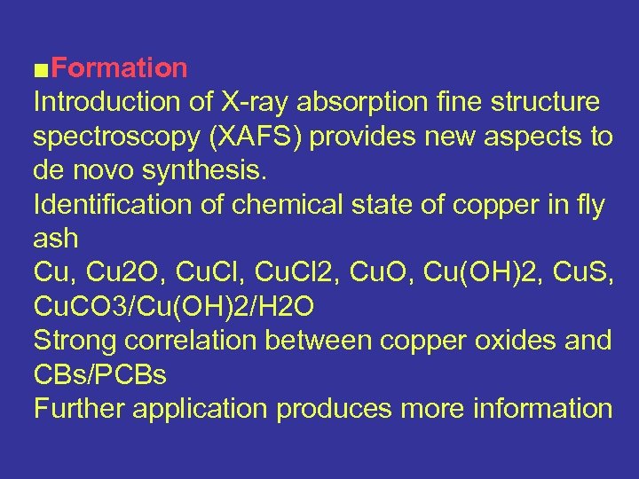 ■Formation Introduction of X-ray absorption fine structure spectroscopy (XAFS) provides new aspects to de novo synthesis. Identification of chemical state of copper in fly ash Cu, Cu 2 O, Cu. Cl 2, Cu. O, Cu(OH)2, Cu. S, Cu. CO 3/Cu(OH)2/H 2 O Strong correlation between copper oxides and CBs/PCBs Further application produces more information