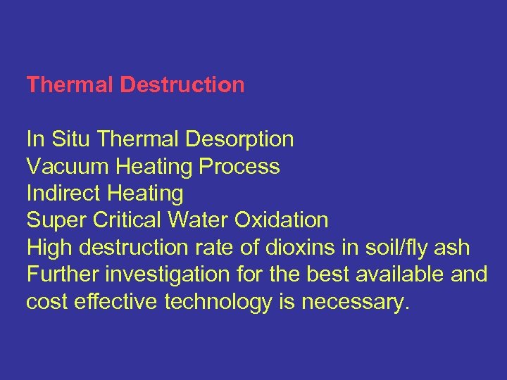 Thermal Destruction In Situ Thermal Desorption Vacuum Heating Process Indirect Heating Super Critical Water Oxidation High destruction rate of dioxins in soil/fly ash Further investigation for the best available and cost effective technology is necessary.