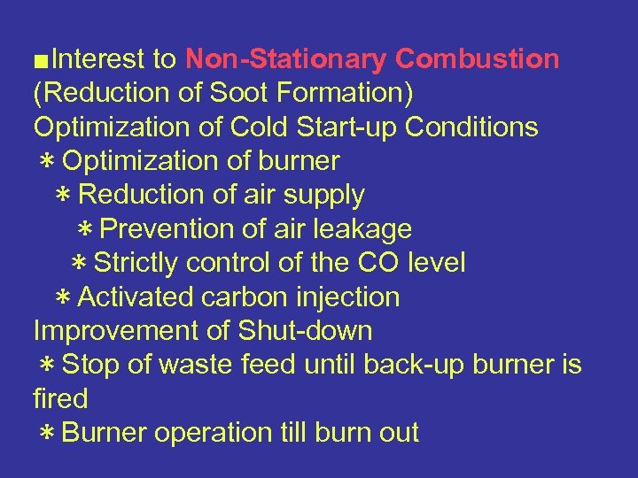 ■Interest to Non-Stationary Combustion (Reduction of Soot Formation) Optimization of Cold Start-up Conditions *Optimization of burner *Reduction of air supply *Prevention of air leakage *Strictly control of the CO level *Activated carbon injection Improvement of Shut-down *Stop of waste feed until back-up burner is fired *Burner operation till burn out
