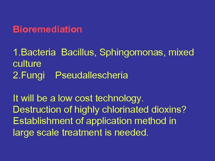 Bioremediation 1. Bacteria Bacillus, Sphingomonas, mixed culture 2. Fungi Pseudallescheria It will be a low cost technology. Destruction of highly chlorinated dioxins? Establishment of application method in large scale treatment is needed.