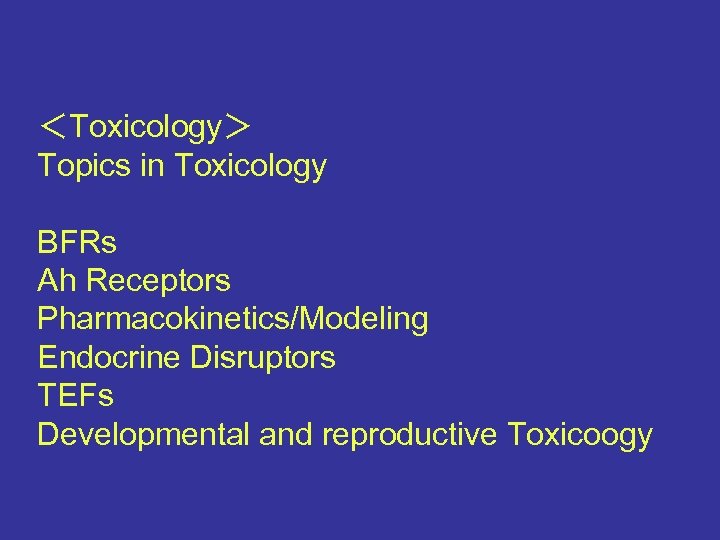 <Toxicology> Topics in Toxicology BFRs Ah Receptors Pharmacokinetics/Modeling Endocrine Disruptors TEFs Developmental and reproductive Toxicoogy