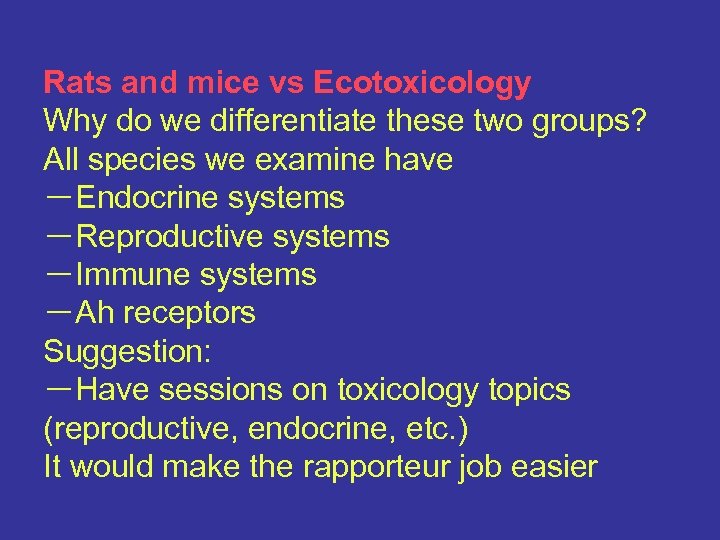 Rats and mice vs Ecotoxicology Why do we differentiate these two groups? All species we examine have -Endocrine systems -Reproductive systems -Immune systems -Ah receptors Suggestion: -Have sessions on toxicology topics (reproductive, endocrine, etc. ) It would make the rapporteur job easier