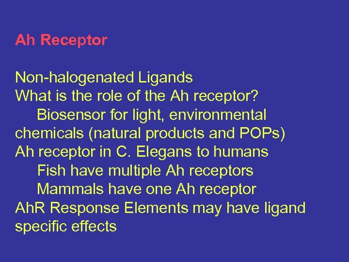 Ah Receptor Non-halogenated Ligands What is the role of the Ah receptor? Biosensor for light, environmental chemicals (natural products and POPs) Ah receptor in C. Elegans to humans Fish have multiple Ah receptors Mammals have one Ah receptor Ah. R Response Elements may have ligand specific effects