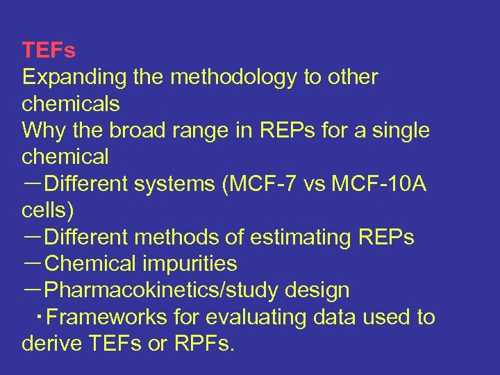 TEFs Expanding the methodology to other chemicals Why the broad range in REPs for a single chemical -Different systems (MCF-7 vs MCF-10 A cells) -Different methods of estimating REPs -Chemical impurities -Pharmacokinetics/study design ・Frameworks for evaluating data used to derive TEFs or RPFs.