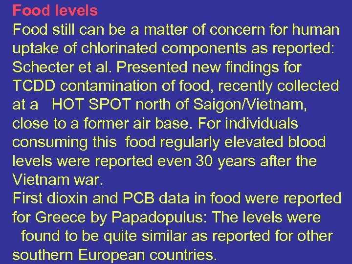 Food levels Food still can be a matter of concern for human uptake of chlorinated components as reported: Schecter et al. Presented new findings for TCDD contamination of food, recently collected at a HOT SPOT north of Saigon/Vietnam, close to a former air base. For individuals consuming this food regularly elevated blood levels were reported even 30 years after the Vietnam war. First dioxin and PCB data in food were reported for Greece by Papadopulus: The levels were found to be quite similar as reported for other southern European countries.