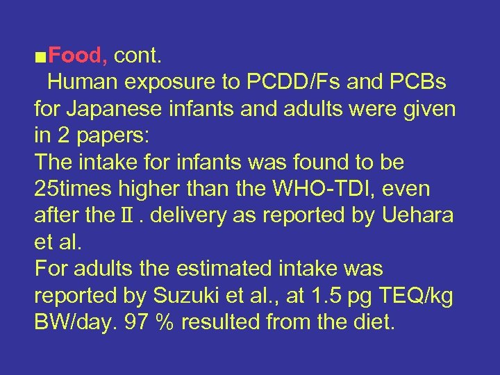 ■Food, cont. Human exposure to PCDD/Fs and PCBs for Japanese infants and adults were given in 2 papers: The intake for infants was found to be 25 times higher than the WHO-TDI, even after theⅡ. delivery as reported by Uehara et al. For adults the estimated intake was reported by Suzuki et al. , at 1. 5 pg TEQ/kg BW/day. 97 % resulted from the diet.