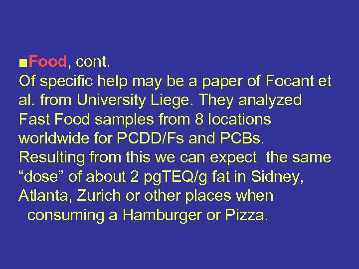 ■Food, cont. Of specific help may be a paper of Focant et al. from University Liege. They analyzed Fast Food samples from 8 locations worldwide for PCDD/Fs and PCBs. Resulting from this we can expect the same “dose” of about 2 pg. TEQ/g fat in Sidney, Atlanta, Zurich or other places when consuming a Hamburger or Pizza.