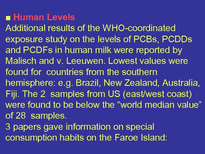 ■ Human Levels Additional results of the WHO-coordinated exposure study on the levels of PCBs, PCDDs and PCDFs in human milk were reported by Malisch and v. Leeuwen. Lowest values were found for countries from the southern hemisphere: e. g. Brazil, New Zealand, Australia, Fiji. The 2 samples from US (east/west coast) were found to be below the “world median value” of 28 samples. 3 papers gave information on special consumption habits on the Faroe Island: