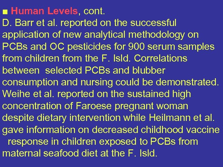 ■ Human Levels, cont. D. Barr et al. reported on the successful application of new analytical methodology on PCBs and OC pesticides for 900 serum samples from children from the F. Isld. Correlations between selected PCBs and blubber consumption and nursing could be demonstrated. Weihe et al. reported on the sustained high concentration of Faroese pregnant woman despite dietary intervention while Heilmann et al. gave information on decreased childhood vaccine response in children exposed to PCBs from maternal seafood diet at the F. Isld.