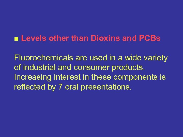 ■ Levels other than Dioxins and PCBs Fluorochemicals are used in a wide variety of industrial and consumer products. Increasing interest in these components is reflected by 7 oral presentations.