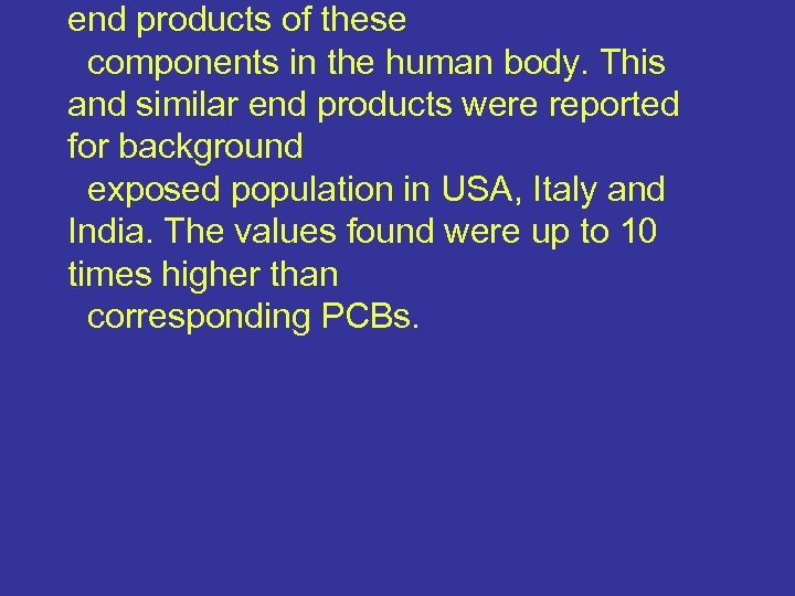 end products of these components in the human body. This and similar end products were reported for background exposed population in USA, Italy and India. The values found were up to 10 times higher than corresponding PCBs.