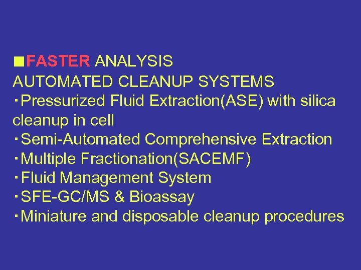 ■FASTER ANALYSIS AUTOMATED CLEANUP SYSTEMS ・Pressurized Fluid Extraction(ASE) with silica cleanup in cell ・Semi-Automated Comprehensive Extraction ・Multiple Fractionation(SACEMF) ・Fluid Management System ・SFE-GC/MS & Bioassay ・Miniature and disposable cleanup procedures