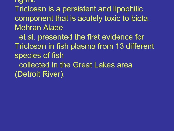 ng/ml. Triclosan is a persistent and lipophilic component that is acutely toxic to biota. Mehran Alaee et al. presented the first evidence for Triclosan in fish plasma from 13 different species of fish collected in the Great Lakes area (Detroit River).