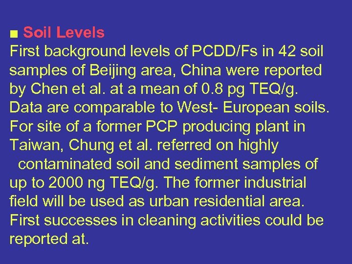 ■ Soil Levels First background levels of PCDD/Fs in 42 soil samples of Beijing area, China were reported by Chen et al. at a mean of 0. 8 pg TEQ/g. Data are comparable to West- European soils. For site of a former PCP producing plant in Taiwan, Chung et al. referred on highly contaminated soil and sediment samples of up to 2000 ng TEQ/g. The former industrial field will be used as urban residential area. First successes in cleaning activities could be reported at.