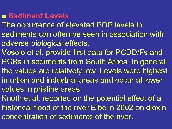 ■ Sediment Levels The occurrence of elevated POP levels in sediments can often be seen in association with adverse biological effects. Vosolo et al. provide first data for PCDD/Fs and PCBs in sediments from South Africa. In general the values are relatively low. Levels were highest in urban and industrial areas and occur at lower values in pristine areas. Knoth et al. reported on the potential effect of a historical flood of the river Elbe in 2002 on dioxin concentration of sediments of the river.