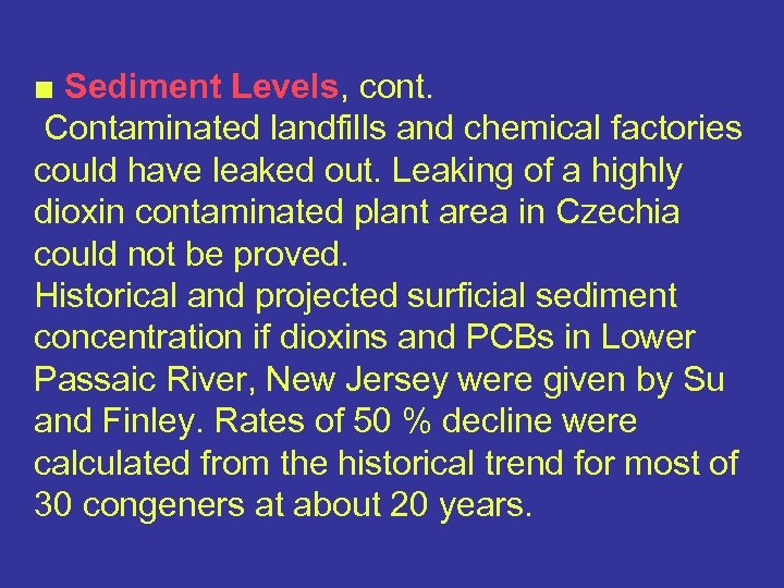 ■ Sediment Levels, cont. Contaminated landfills and chemical factories could have leaked out. Leaking of a highly dioxin contaminated plant area in Czechia could not be proved. Historical and projected surficial sediment concentration if dioxins and PCBs in Lower Passaic River, New Jersey were given by Su and Finley. Rates of 50 % decline were calculated from the historical trend for most of 30 congeners at about 20 years.