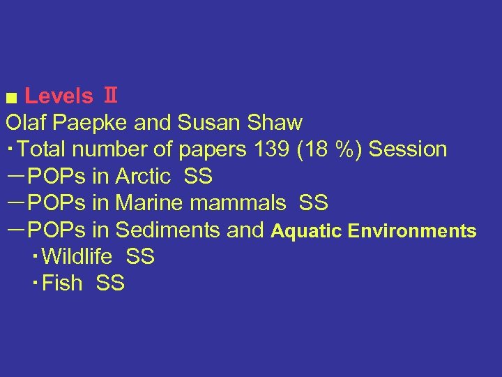 ■ Levels Ⅱ Olaf Paepke and Susan Shaw ・Total number of papers 139 (18 %) Session -POPs in Arctic SS -POPs in Marine mammals SS -POPs in Sediments and Aquatic Environments ・Wildlife SS ・Fish SS