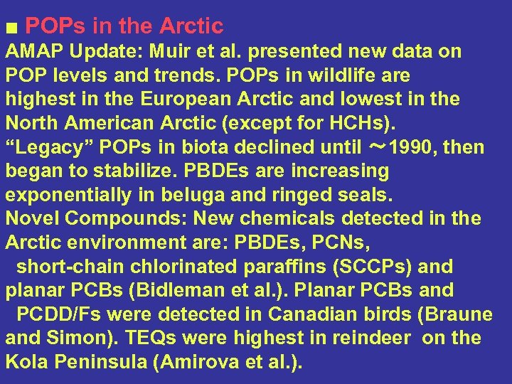 ■ POPs in the Arctic AMAP Update: Muir et al. presented new data on POP levels and trends. POPs in wildlife are highest in the European Arctic and lowest in the North American Arctic (except for HCHs). “Legacy” POPs in biota declined until ~ 1990, then began to stabilize. PBDEs are increasing exponentially in beluga and ringed seals. Novel Compounds: New chemicals detected in the Arctic environment are: PBDEs, PCNs, short-chain chlorinated paraffins (SCCPs) and planar PCBs (Bidleman et al. ). Planar PCBs and PCDD/Fs were detected in Canadian birds (Braune and Simon). TEQs were highest in reindeer on the Kola Peninsula (Amirova et al. ).