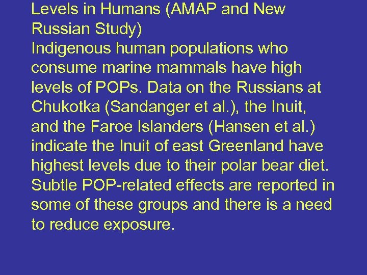 Levels in Humans (AMAP and New Russian Study) Indigenous human populations who consume marine mammals have high levels of POPs. Data on the Russians at Chukotka (Sandanger et al. ), the Inuit, and the Faroe Islanders (Hansen et al. ) indicate the Inuit of east Greenland have highest levels due to their polar bear diet. Subtle POP-related effects are reported in some of these groups and there is a need to reduce exposure.