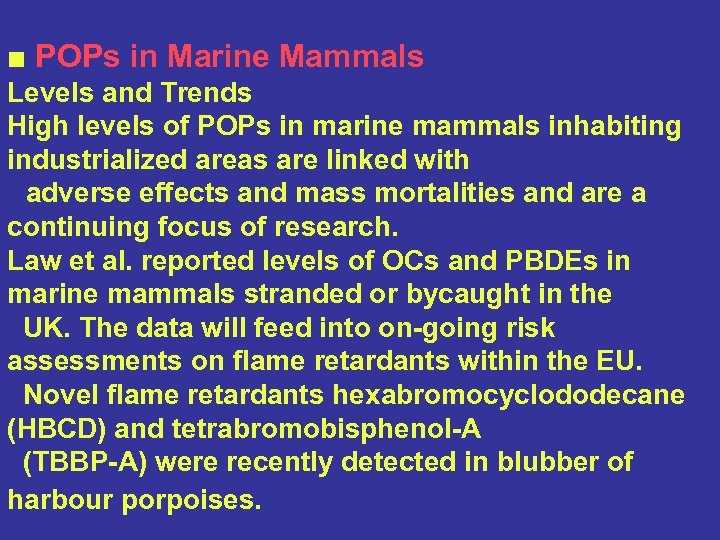 ■ POPs in Marine Mammals Levels and Trends High levels of POPs in marine mammals inhabiting industrialized areas are linked with adverse effects and mass mortalities and are a continuing focus of research. Law et al. reported levels of OCs and PBDEs in marine mammals stranded or bycaught in the UK. The data will feed into on-going risk assessments on flame retardants within the EU. Novel flame retardants hexabromocyclododecane (HBCD) and tetrabromobisphenol-A (TBBP-A) were recently detected in blubber of harbour porpoises.